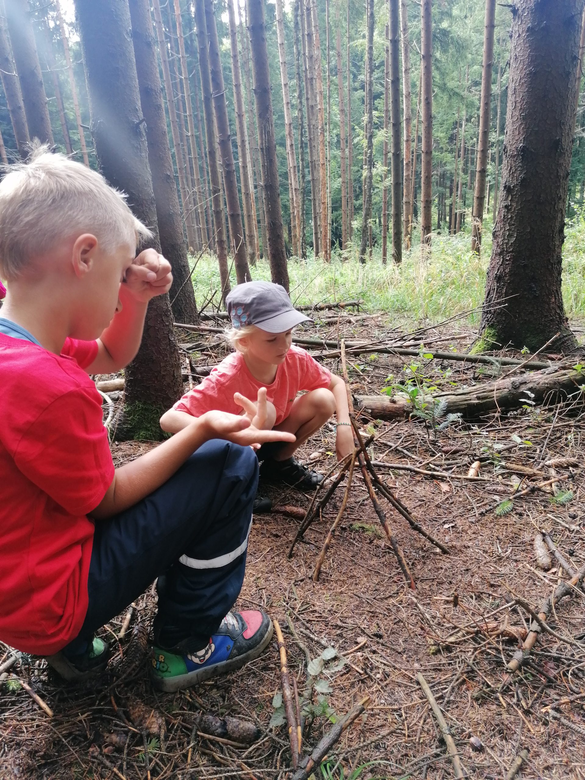 Die Kinder fingen eifrig an Äste zu sammeln und schon nach kurzer Zeit entstanden 2 großartige Waldhäuschen. Zum Schluss wurde ein Häuschen noch dekoriert und mit einem Tisch ausgestattet.